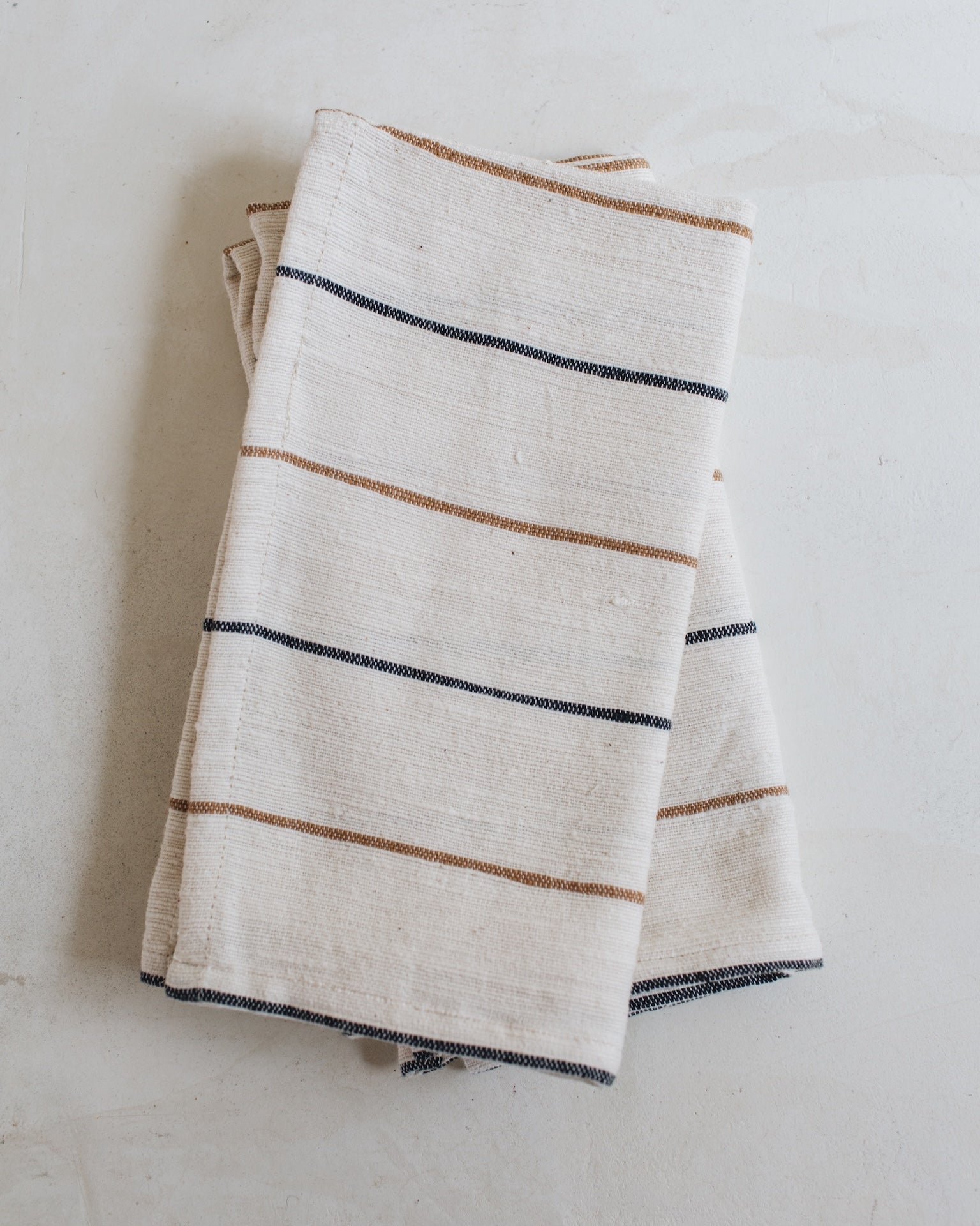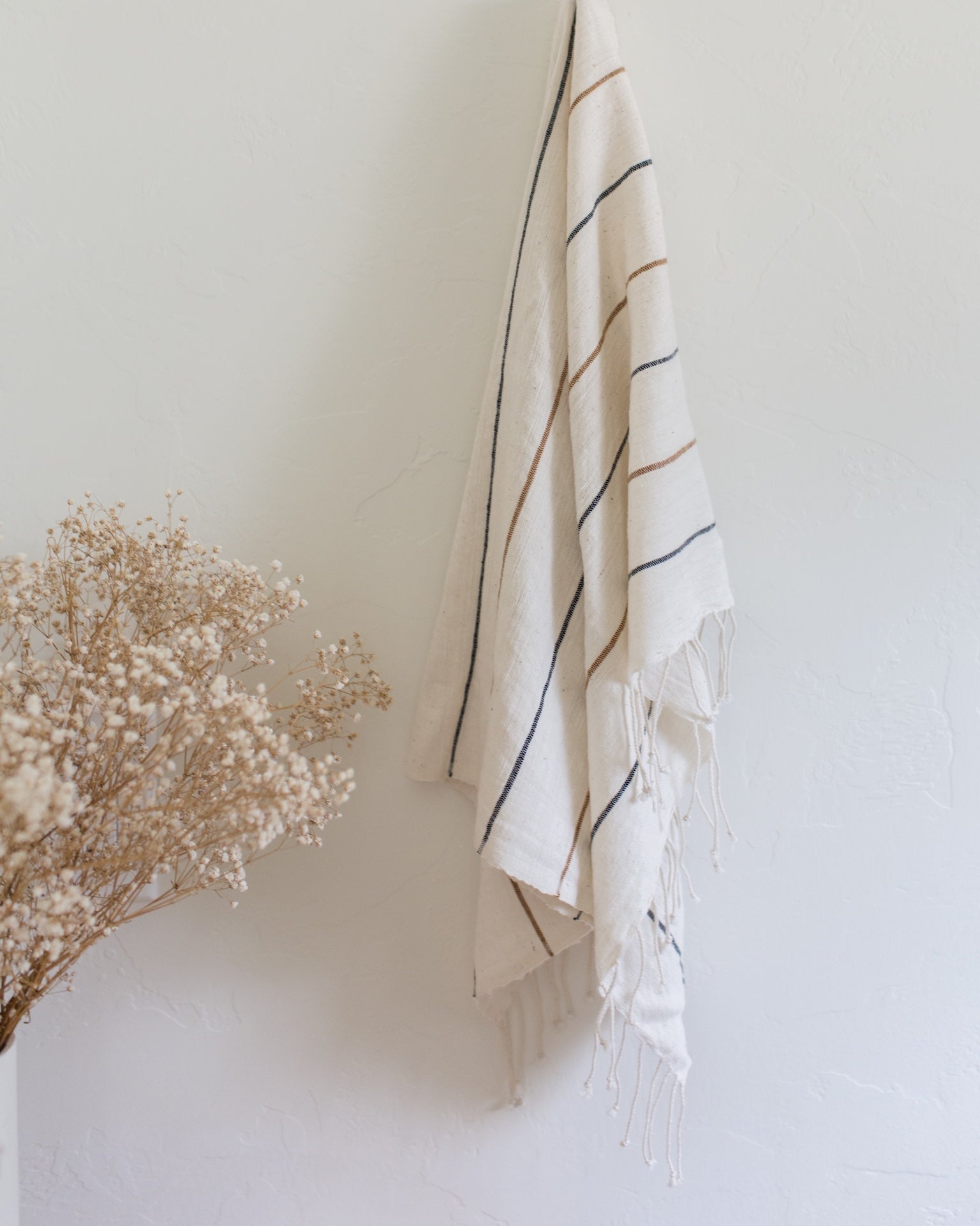 From decorating your bed or couch and keeping you warm in the winter to using as a large picnic blanket in the summer, this light weight blanket can be used year round. This beautiful and versatile blanket is 100% Cotton, Fair Trade and eco friendly. It matches our Cream with Black and Bronze Striped Large Towels and Napkins. The blanket is finished with a fun twisted fringe.