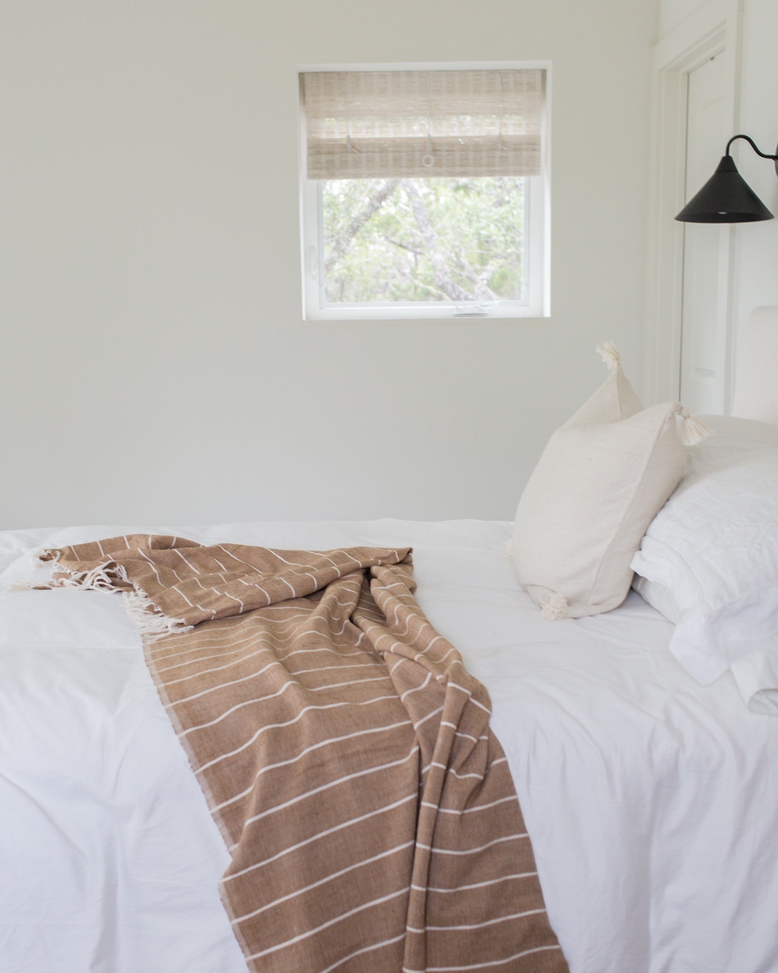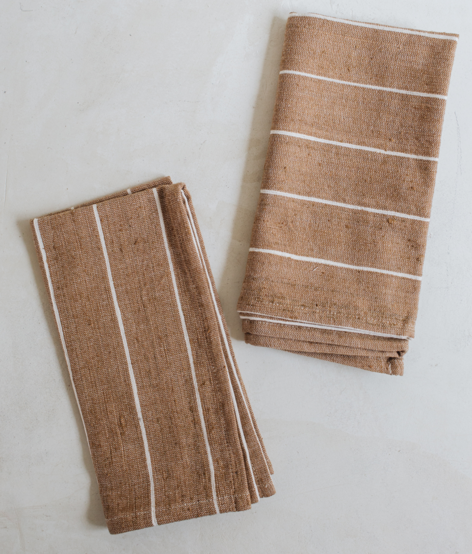 From decorating your bed or couch and keeping you warm in the winter to using as a large picnic blanket in the summer, this light weight blanket can be used year round. This beautiful and versatile blanket is 100% Cotton, Fair Trade and eco friendly. It matches our Bronze with Cream Stripes Hand Towels and Napkins. The blanket is finished with a fun twisted fringe.